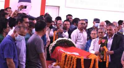 काठमाडौँ, २८ भदौ । संविधानसभाका अध्यक्ष एवं नेकपा (एमाले)का उपाध्यक्ष सुवासचन्द्र नेम्वाङको अन्त्येष्टि आज शवयात्रासहित पशुपति आर्यघाटमा राजकीय सम्मानका साथ हुँदैछ । उनको शवयात्रामा सहभागी भई अन्तिम श्रद्धाञ्जली अपर्णका लागि