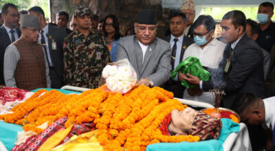 काठमाडौँ, ६ भदौ । प्रधानमन्त्री पुष्पकमल दाहाल प्रचण्डले सँस्कृति पर्यटन तथा नागरिक उड्डयनमन्त्री सुदन किराँतीका बुवा हर्कबहादुर राईप्रति श्रद्धाञ्जली अर्पण गरेका छन् । मन्त्री निवास पुलचोक पुगेर प्रधानमन्त्री प्रचण्डले श्रद्धाञ्जली