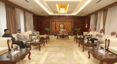 काठमाडौं, ११ जेठ । प्रमुख दलका शीर्ष नेताहरूको बैठक प्रधानमन्त्री निवास बालुवाटारमा सुरु भएको छ। बैठकमा प्रधानमन्त्री पुष्पकमल दाहाल प्रचण्ड, नेकपा एमालेका अध्यक्ष केपी शर्मा ओली, नेपाली काँग्रेसका महामन्त्री गगन