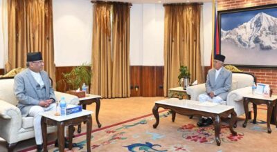 काठमाडौँ, ११ जेठ । राष्ट्रपति रामचन्द्र पौडेलसँग प्रधानमन्त्री पुष्पकमल दाहालले शुक्रबार बिहान राष्ट्रपति भवन शीतल निवासमा भेट गर्नुभएको छ । सो भेटमा राष्ट्रपति पौडेलले जारी संसद्को गतिरोधबारे चासो र चिन्ता