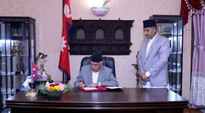 काठमाडौँ, २३ वैशाख । राष्ट्रपति रामचन्द्र पौडेलले खाद्य स्वच्छता तथा गुणस्तरसम्बन्धी कानुनलाई संशोधन र एकीकरण गर्न बनेको विधेयक प्रमाणीकरण गर्नुभएको छ । आइतबार राष्ट्रपति पौडेलले सो विधेयक प्रमाणीकरण गर्नुभएको राष्ट्रपति