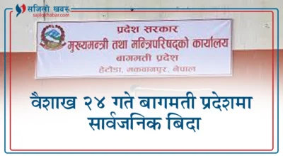 मकवानपुर, २३ वैशाख । बागमती मन्त्रिपरिषद्को बैठकले प्रदेशमा सरकारी काम काजको भाषा प्रयोगमा ल्याउने क्रममा भोलि वैशाख २४ गते प्रदेशभर सार्वजनिक बिदा दिने निर्णय गरेको छ । प्रदेशभित्र सरकारी काम
