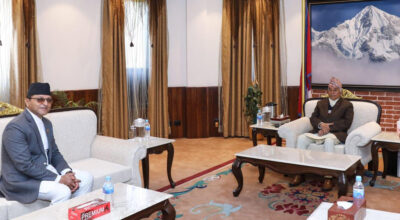 काठमाडौँ, ११ फागुन । राष्ट्रपति रामचन्द्र पौडेलसँग राष्ट्रियसभाका अध्यक्ष गणेशप्रसाद तिमिल्सनाले शिष्टाचार भेटवार्ता गरेका छन् । राष्ट्रपति भवन शीतल निवासमा आज बिहान भएको सो भेटमा समसामयिक विषयमा छलफल भएको राष्ट्रपतिको