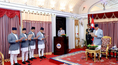 काठमाडौँ, १० असोज । राष्ट्रपति रामचन्द्र पौडेलसमक्ष विभिन्न चार मुलुकका लागि नियुक्त नेपाली राजदूतहरुले पद तथा गोपनियताको शपथ लिएका छन् । राष्ट्रपति कार्यालय शितल निवासमा आज आयोजित समारोहमा सुधीर भट्टराई