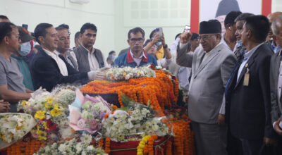 ललितपुर, २६ भदौ । प्रधानमन्त्री पुष्पकमल दाहाल ‘प्रचण्ड’ ललितपुरको च्यासलस्थित नेकपा (एमाले)को केन्द्रिय कार्यालयमा गएर त्यहाँ राखिएको पूर्वसभामुख सुवास नेम्वाङको पार्थिव शरीरमा फूलमाला चढाई श्रद्धाञ्जलि अर्पण गरेका छन् । यस्तै