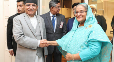 काठमाडौँ, ९ साउन । प्रधानमन्त्री पुष्पकमल दाहाल ‘प्रचण्ड’ र बङ्गलादेशका प्रधानमन्त्री शेख हसिनाबीच द्विपक्षीय हित र चासोका बारेमा छलफल भएको छ । इटाली भ्रमणमा रहेका प्रधानमन्त्री प्रचण्ड र उनका बङ्गलादेशी