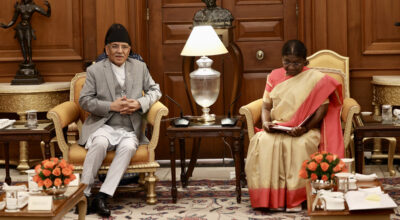 नयाँदिल्ली, १८ जेठ । भारत भ्रमणमा रहेका प्रधानमन्त्री पुष्पकमल दाहाल ‘प्रचण्ड’ ले भारतका राष्ट्रपति द्रौपदी मुर्मूसँग शिष्टाचार भेटवार्ता गरेका छन् । राष्ट्रपति भवनमा आज भएको भेटमा उनीहरूबीच द्विपक्षीय हितका विविध