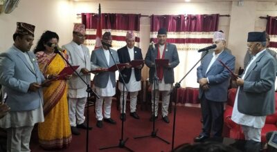 काठमाडौँ, ७ जेठ । बाग्मती प्रदेशका नवनियुक्त छ जना मन्त्रीले पद तथा गोपनीयताको शपथ लिएका छन् । नवनियुक्त मन्त्रीहरूलाई प्रदेश प्रमुख यादवचन्द्र शर्माले शपथ गराएका हुन् । आइतवार मुख्यमन्त्री शालिकराम