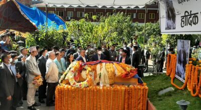 काठमाडौँ, ३० असोज । वाङ्मय शताब्दी पुरुष सत्यमोहन जोशीको पार्थीव शरीरमा प्रधानमन्त्री एवम् नेपाली कांग्रेसका सभापति शेरबहादुर देउवा र नेकपा माओवादी केन्द्रका अध्यक्ष पुष्पकमल दाहाल प्रचण्डले श्रद्धाञ्जली अर्पण गरेका छन्