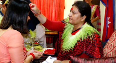 फाइल तस्बिर काठमाडौँ, १९ असोज । राष्ट्रपति विद्यादेवी भण्डारीले आज टीका लगाइदिने भएकी छन् । राष्ट्रपति कार्यलयमा टीका र प्रसाद प्रदान कार्यक्रम राखेको छ । दिउँसो दुईदेखि तीन बजे विशिष्ट