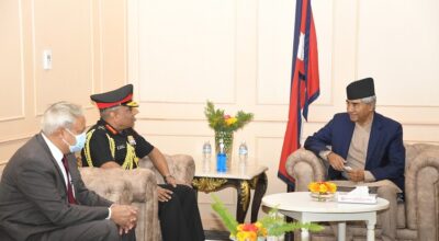 काठमाडौँ, २१ भदौ । प्रधानमन्त्री तथा रक्षामन्त्री शेरबहादुर देउवासँग भारतीय स्थल सेनाध्यक्ष मनोज पाण्डेले भेटवार्ता गरेका छन् । प्रधानसेनापति प्रभुराम शर्माको निमन्त्रणामा आइतवार नेपाल आएका भारतीय सेनाध्यक्ष पाण्डेले मङ्गलवार प्रधानमन्त्री