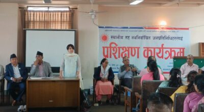 काठमाडौँ, २१ जेठ । नेकपा (एमाले) काठमाडौँ जिल्ला कमिटीले स्थानीय तहका नवनिर्वाचित जनप्रतिनिधिहरूलाई स्थानीय तह सञ्चालन सम्बन्धी दुई दिने प्रशिक्षण कार्यक्रमको आयोजना गरेको छ । पार्टीको निर्वाचन सम्बन्धी घोषणा पत्र,