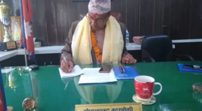 झापा, १३ जेष्ठ । मेचीनगर नगरपालिकाका नवनिर्वाचित नगरप्रमुख गोपालचन्द्र बुढाथोकीले पद बहाली गरेका छन् । नगरप्रमुख बुढाथोकीले बिहीबार कार्यकक्षमा पुगेर पद बहाली गरेका हुन् । नगरका प्रमुख प्रशासकिय अधिकृत सुरेश