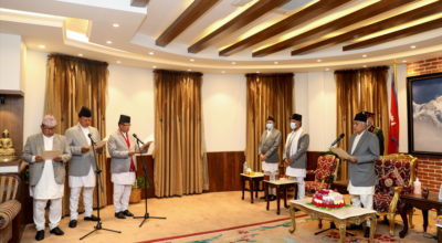 काठमाडौँ, २१ वैशाख । नवनियुक्त तीन मन्त्रीले पद तथा गोपनीयताको शपथ लिएका छन् । कानुन, न्याय तथा संसदीय मामिलामन्त्री धनराज गुरुङ, स्वास्थ्य तथा जनसङ्ख्यामन्त्री मोहनबहादुर बस्नेत र युवा तथा खेलकुदमन्त्री