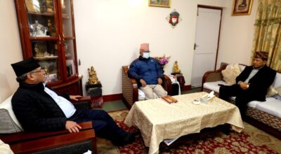 काठमाडौँ, २२ फागुन । प्रधानमन्त्री पुष्पकमल दाहाल प्रचण्ड र नेकपा एमालेका अध्यक्ष केपी शर्मा ओली नेकपा एकीकृत समाजवादीका अध्यक्ष माधवकुमार नेपालको निवासमा पुगेका छन् । उनीहरू बालुवाटारमा जारी गठबन्धन बैठकको