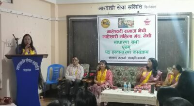झापा, १६ चैत । माहेश्वरी समाज मेची र महेश्वरी महिला मञ्चको संयुक्त साधारणसभा तथा पद हस्तान्तरण कार्यक्रम बिर्तामोडस्थित मारवाडी सेवा समाजको सभाहलमा सम्पन्न भएको छ। नेपाल राष्ट्रिय मारवाडी महिला संगठनकी