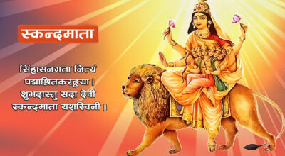 काठमाडौं, २२ असोज । आश्विन शुक्ल पञ्चमी अर्थात् नवरात्रको छैटौँ दिन आज दसैँ घर वा पूजा कोठामा नौ दुर्गामध्येकी पाँचौँ स्कन्दमाताको विधिपूर्वक पूजा आराधना गरिँदै छ । छान्दोग्य श्रुतीका अनुसार