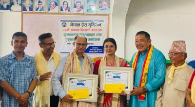 झापा, १३ जेठ । नेपाल प्रेस युनियन झापाले ३३ औं स्थापना दिवसको अवसर पारेर दुईजना पत्रकारलाई सम्मान गरेको छ । नेपाल प्रेस युनियन झापाले विर्तामोडमा आयोजना गरेको कार्यक्रममा टंकप्रसाद रमादेवी