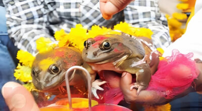 झापा, २३ वैशाख । लामो समयसम्म पानी नपरेर खडेरीको सामना गर्नु परेको भन्दै झापा अर्जुनधाराका किसानहरुले शनिबार भ्यागुताको विवाह गरिदिएका छन् । अर्जुनधारा वडा नम्बर २ का किसानले टाङटिङ खोलामा