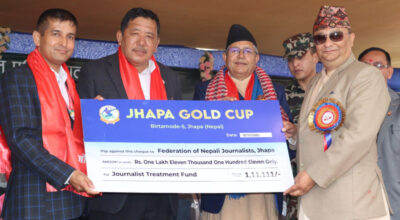 झापा, ११ फागुन । नेपाल पत्रकार महासंघ झापा शाखाले स्थापना गरेको ‘पत्रकार सहारा उपचार कोष’ लाई झापा गोल्डकपले सहयोग प्रदान गरेको छ । ‘अर्ना छैठौं झापा गोल्डकप’ उद्घाटन समारोहको अबसर