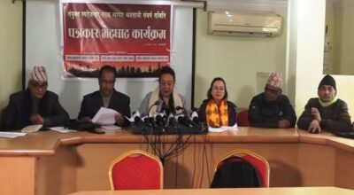 काठमाडौँ, १२ माघ । संयुक्त स्वरोजगार सडक व्यापार व्यवसायी सङ्घर्ष समितिले सातबुँदे माग राख्दै काठमाडौँ महानगरपालिकाविरुद्ध चरणबद्ध आन्दोलन घोषणा गरेको छ । आज पत्रकार सम्मेलन गर्दै सङ्घर्ष समितिले यही माघ