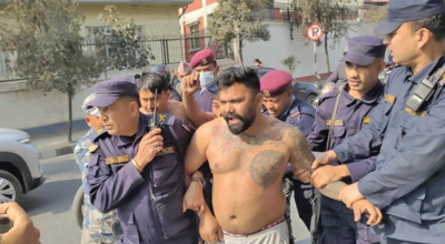 काठमाडौँ, १६ पुस । सिंहदरबारस्थित प्रधानमन्त्री तथा मन्त्रिपरिषद्को कार्यालय अघि तीन जना युवाहरूले अर्धनग्न प्रदर्शन गरेका छन् । प्रदर्शन उत्रिएका उनीहरुलाई लगत्तै प्रहरीले नियन्त्रणमा लिएको छ । नेकपा क्रान्तिकारी माओवादी