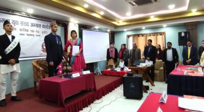 झापा, १८ कात्तिक । “माननीय संसद् सदस्य प्रस्तावको पक्षमा हुनेहरुले ‘हुन्छ’ भन्नुहोस्, प्रस्तावको विपक्षमा हुनेहरुले ‘हुन्न’ भन्नुहोस् ।” झापाको विर्तामोडमा शुक्रबार सङ्घीय संसद् सचिवालयले आयोजना गरेको ‘नमूना युवा संसद् अभ्यास