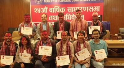 काठमाडौँ, १७ भदौ । नेपाल आर्थिक पत्रकार समाज (सेजन)को अध्यक्षमा सुजन ओली निर्वाचित भएका छन् । सेजनको शनिवार सप्पन्न २५औँ वार्षिक साधारणसभा तथा अधिवेशनबाट ओलीको नेतृत्वमा नयाँ कार्यसमिति निर्वाचित भएको