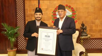 काठमाडौँ, १९ असार । प्रधानमन्त्री पुष्पकमल दाहाल ‘प्रचण्ड’ले मेमोरी किङका रुपमा चर्चित अर्पण शर्मालाई बधाई तथा शुभकामना दिनुभएको छ । प्रधानमन्त्री निवास बालुवाटारमा आज बिहान भएको भेटमा प्रधानमन्त्री प्रचण्डले शर्मालाई