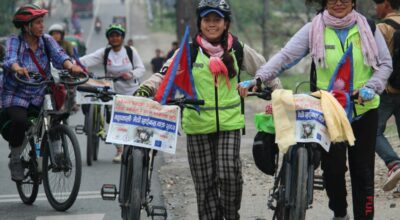 झापा, २७ वैशाख । दलितमाथि हुँदै आएका सबैखाले विभेदको अन्त्यका लागि जनचेतना जगाउन महाकालीबाट तीन महिला पत्रकारले सुरु गरेको साइकलयात्रा मङ्गलबार साँझ काँकडभिट्टाको मेची पुलमा समापन भएको छ । यही