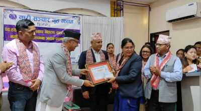 झापा, ६ वैशाख । नारी सञ्चार गृह झापाले नेपालको पहिलो सम्पादक महिला साधना प्रधानको सम्मानमा स्थापना गरेको ‘नारी सञ्चार साधना पत्रकारिता पुरस्कार’बाट अग्रज पत्रकार सावित्रा दाहाल पुरस्कृत भएकी छन् ।