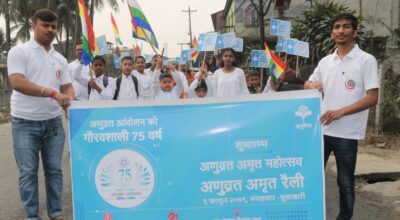 मेचीनगर, ९ फागुन । अणुव्रत आन्दोलनको ७५ वर्ष पुगेको अवसरमा झापाको मेचीनगरमा प्रभातफेरीसहित कार्यक्रम सम्पन्न भएको छ । जैन समाज धुलाबारीको आयोजनामा भएको प्रभातफेरी इन्द्रचन्द बोथराको घरबाट सुरु भएर धुलाबारी