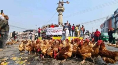 बिर्तामोड, २४ माघ । झापाका कुखुरापालक किसानहरूले जिउँदो कुखुरा तथा अण्डा सडकमा फालेर बिरोध जनाएका छन् । उत्पादित बस्तुको उचित मूल्य नपाएको भन्दै अण्डा र कुखुरा बिर्तामोडको मुक्तिचोकमा फ्याँकेर बिरोध