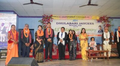 मेचीनगर, १७ माघ । धुलाबारी जेसीजको ४३ औं पद हस्तान्तरण कार्यक्रम सम्पन्न भएको छ । धुलाबारी टाउनहलमा आइतबार धुलाबारी जेसीजको ४३ औं पद हस्तान्तरण र जुनियर जेसीजको ५औं पद हस्तान्तरण