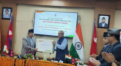 काठमाडौँ, ३१ असार । भारतले नेपालको बाढी तथा प्राकृतिक प्रकोप प्रभावितका लागि राहत सामग्री सहयोग गरेको छ । भारतले तीन हजार टेन्ट र १० रबरबोट सहयोग गरेको आज सिंहदरबारमा आयोजित