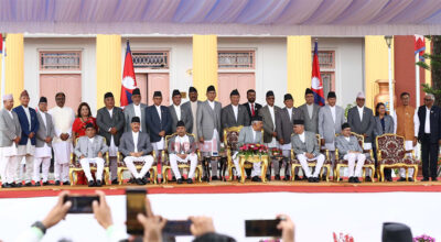 काठमाडौं, ३१ असार । राष्ट्रपति रामचन्द्र पौडेलले नवनियुक्त १९ मन्त्रीलाई आज पद तथा गोपनीयताको शपथ गराउनुभएको छ । नवनियुक्त मन्त्रीहरुले आज बिहान राष्ट्रपति भवन शीतल निवासमा आयोजित विशेष समारोहमा राष्ट्रपति