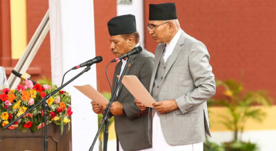 काठमाडौं, ३१ असार । राष्ट्रपति रामचन्द्र पौडेलले नवनियुक्त उपप्रधानमन्त्री प्रकाशमान सिंह र विष्णुप्रसाद पौडेललाई आज पद तथा गोपनीयताको शपथ गराउनुभएको छ । नवनियुक्त उपप्रधानमन्त्री एवं सहरी विकासमन्त्री सिंह र उप्रधानमन्त्री