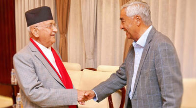 काठमाडौँ, २६ असार। नेपाली कांग्रेसका सभापति शेरबहादुर देउवा र नेकपा (एमाले) का अध्यक्ष केपी शर्मा ओलीबिच भेटवार्ता भएको छ। देउवा निवास बुढानीलकण्ठमा बुधबार साँझ उहाहरूबिच २ घण्टा भेटवार्ता भएको हो।