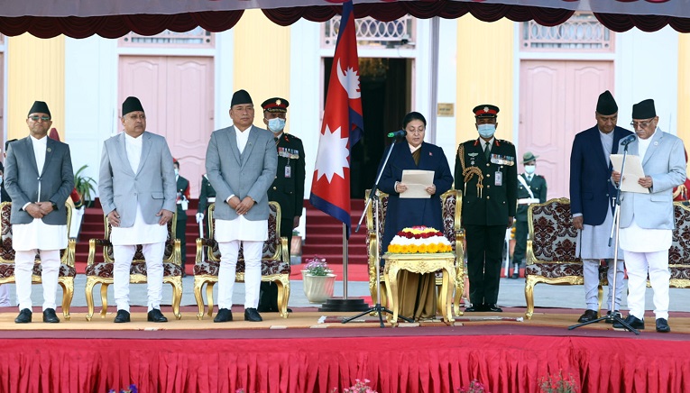 Vice President Nanda Bahadur Pun, outgoing Prime Minister Sher Bahadur Deuba, National Assembly Chairperson Ganesh Prasad Timilsina, and Acting Chief Justice of the Supreme Court Hari Krishna Karki were present on the occasion. Also present in the swearing-in ceremony were former Prime Minister and CPN (UML) Chair KP Sharma Oli, CPN (Unified Socialist) Chair Madhav Kumar Nepal, former Prime Minister Dr Baburam Bhattarai, among other dignitaries.